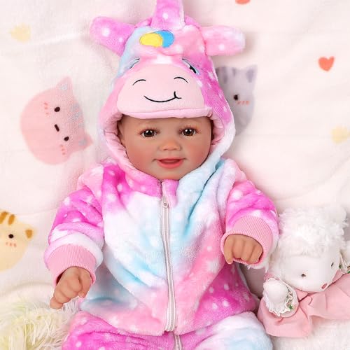 Lifelike Realistic Baby Doll: The body of the reborn doll is made of cloth and the rest is made of vinyl, and every detail has been carefully crafted. Her cute smile, delicate texture, big bright eyes, and half-moon nails are all extremely real and can immerse us in the joy of taking care of a baby. Poseable Realistic Baby Doll: The body of the reborn baby doll is very flexible and its limbs can be put into different positions to express different emotions. Her flexibility allows you to interact and play together, such as sitting and watching TV together. Newborn-Size: The length of the lifelike baby doll from head to toe is 17 inches, this size is very suitable for small children over 3 years old, they can effortlessly lift the doll to interact with it.