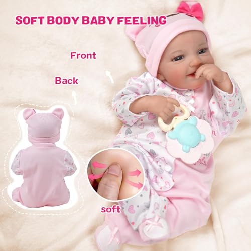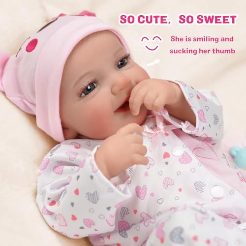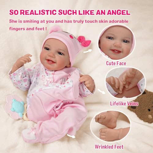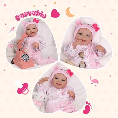 💗💗Unwiderstehliches realistisches Baby: Die realistische Babypuppe fühlt sich weich und geschmeidig an wie echte Haut und fängt jede Nuance des neugeborenen Mädchens perfekt ein. Subtile, naturgetreue, handgemalte Gesichts- und Körperdetails, die ihr ein sonnengeküsstes Strahlen, ein funkelndes Lächeln, große Augen und sogar zarte, handgemalte Wimpern verleihen, machen diese lebensechte Babypuppe absolut unwiderstehlich.