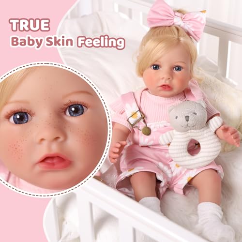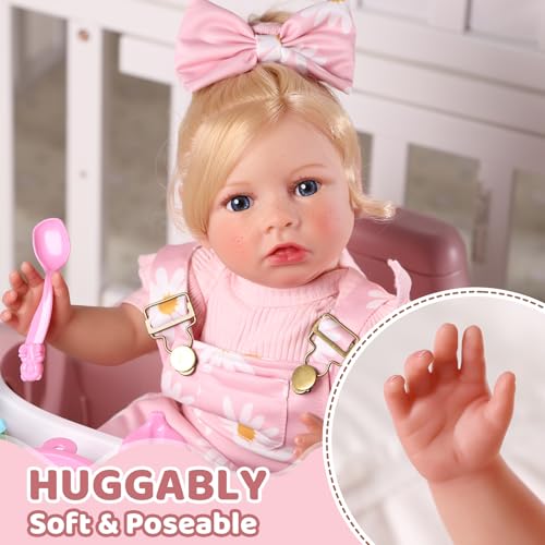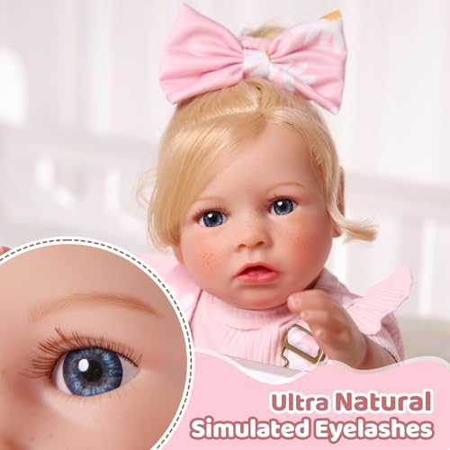 🍭 Lebensechte Details: Diese reborn puppe besticht durch unglaubliche Details! Die handimplantierten Wimpern sind lang und leuchtend, die zarten Gesichtszüge lebensecht, die halbmondförmigen Nägel zart und lieblich und bekannt als die Kapillaren in der Haut sind naturgetreu. Die Puppe hat dessen ungeachtet handimplantiertes goldenes Haar, das auf verschiedene Arten getragen und gestylt werden kann.