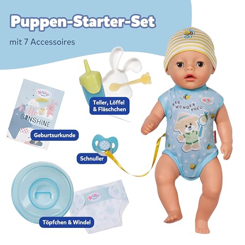LIEFERUMFANG – BABY born Lukas 36 cm inklusive Strampler, Mütze, Töpfchen, Stoffwindel, Flasche, Teller & Löffel sowie der magische Schnuller & ein Geburtspass.
