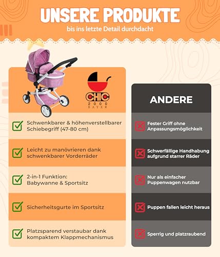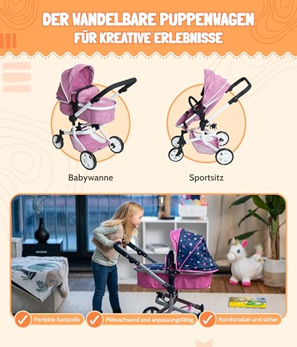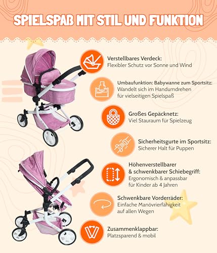 🌟 GRENZENLOSER SPIELSPASS: Der Puppenwagen Mika bietet eine 2-in-1-Funktion: Wandelbar von Babywanne zu Sportsitz – ideal für kreatives Spielen und Abenteuer.