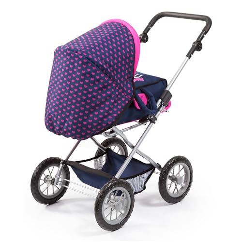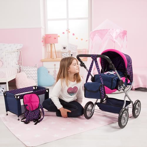 Bayer Design 15054AB Puppenwagen Grande mit Tasche, Puppenbett, Puppentrage, Puppenzubehör, höhenverstellbarer Griff, herausnehmbare Tragetasche, Blau, Rosa, Einhorn