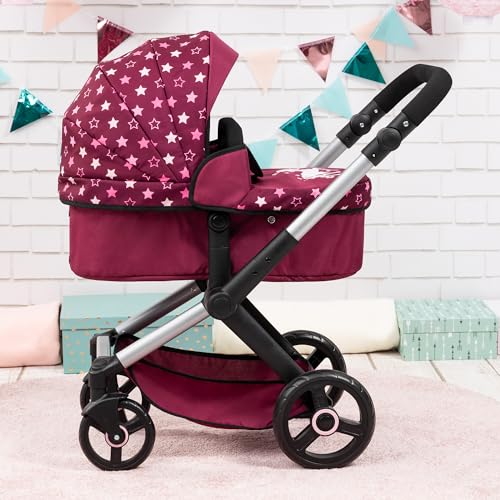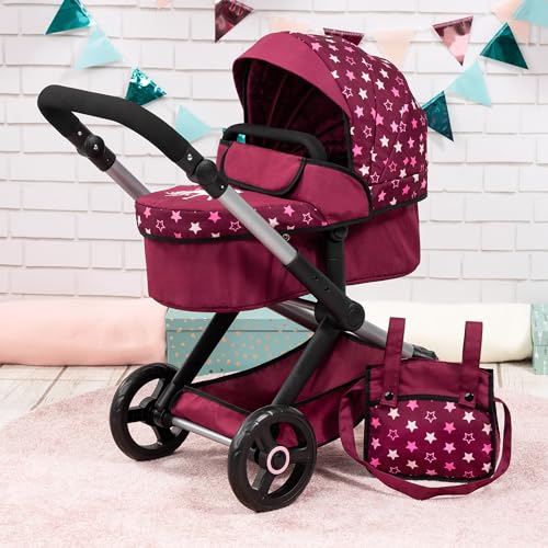 Bayer Design 17023AA Puppenwagen Xeo mit Tasche, höhenverstellbarer Griff, Schwenkschieber, wandelbar als Puppenjogger, bewegliche Vorderräder, integrierter Korb, Bordeaux, Rosa