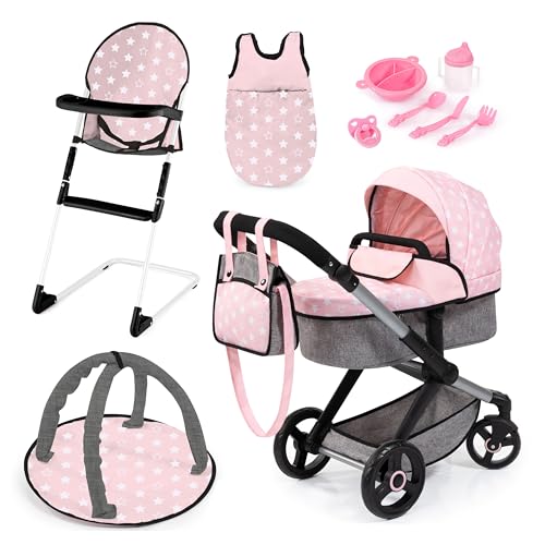 Puppenwagen Set mit Hochstuhl, Umhängetasche, Schlafsack, Spielbogen und Puppenzubehör