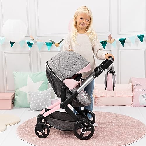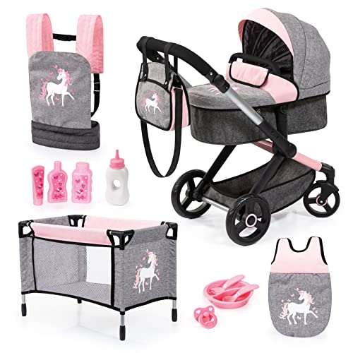 Bayer Design 17033AB, Puppenwagen-Set Xeo, Puppenbett, Trage, Schlafsack, Tasche, Zubehör, Jeans-grau, rosa
