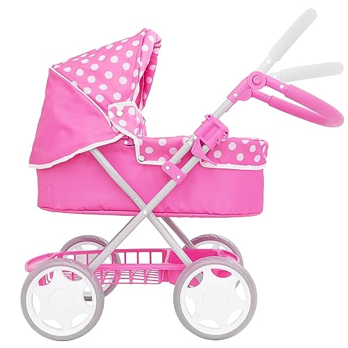 👶💕 Dolly Tots Junior-Puppenwagen – Der perfekte erste Kinderwagen für kleine Eltern! Verstellbarer Spielzeug-Kinderwagen für Babypuppen, faltbar, leicht und reisefreundlich, ab 3 Jahren, passend für Puppen bis zu 45 cm. Geben Sie Ihrem Kind das Geschenk des pflegenden, fantasievollen Spielens mit dem Dolly Tots Junior-Kinderwagen – ein schöner und realistischer Puppenwagen für Kleinkinder, Vorschüler und Kinder ab 3 Jahren. Dieser klassische Baby-Puppenwagen ist in einem süßen rosa gepunkteten Design gestaltet und sieht genauso aus wie echt. Er verfügt über eine verstellbare Kapuze, einen höhenverstellbaren Griff und einen geräumigen Aufbewahrungskorb unter dem Sitz für Puppenzubehör, Taschen, Flaschen und mehr