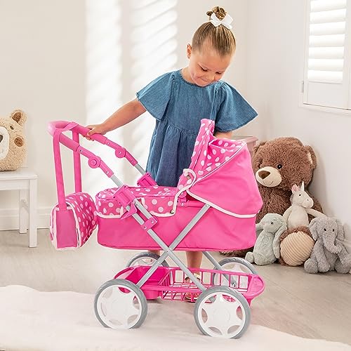 Dolly Tots Junior Puppenwagen Rosa mit Polka-Dots | Spielzeugwagen mit Tasche & klappbarem Verdeck | Stauraum unter dem Wagen | Puppenzubehör ab 3 Jahren
