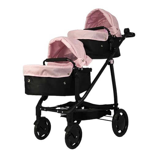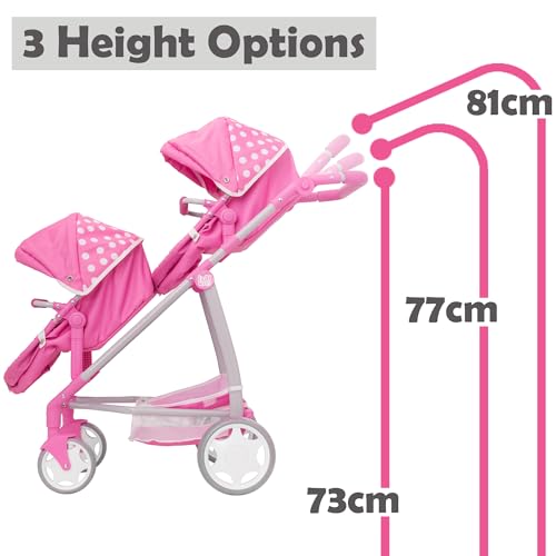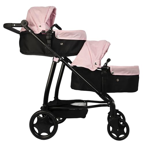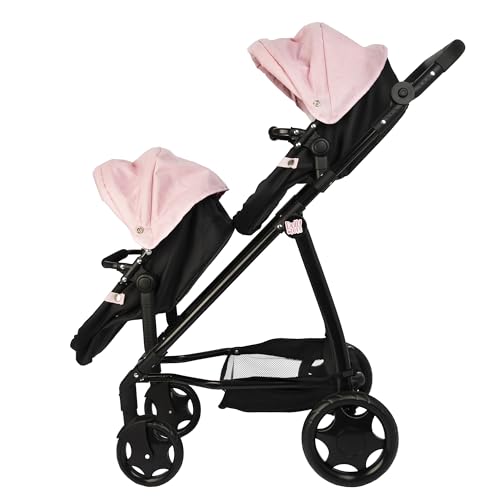 DOLLY TOTS ZWILLINGS-PUPPENWAGEN – Der Dolly Tots Zwillingsbuggy bzw. Puppenwagen sorgt für doppelten Spielspaß und ist der perfekte Zwillingswagen für die Lieblingspuppen Ihres Kindes. Dieser hübsche Puppen-Kinderwagen verfügt über ein lückenlos verstellbares Verdeck und ist in einer verspielten rosa-schwarzen Farbkombination erhältlich. Mit mehreren Spielmodi können Mädchen und Jungen ihre Lieblingspuppen auf jede Reise abstauben. Das Modell Evalite ist mit schwenkbaren Vorderrädern für einfaches Lenken ausgestattet und lässt sich flach zusammenklappen, um platzsparend verstaut zu werden – ideal für Kleinkinder und Kinder, die beim Rollenspiel viel Freude haben.