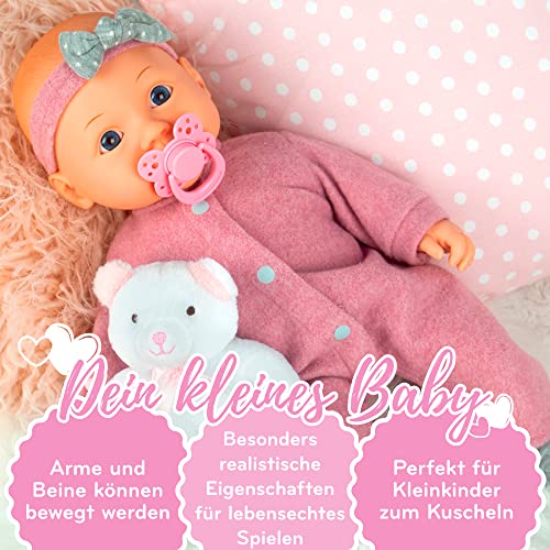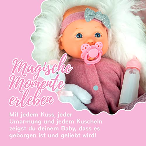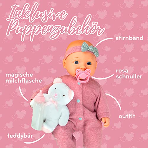 LIEBLINGSPUPPE FÜR ALLE ABENTEUER – Diese realistisch aussehende neugeborene Babypuppe trägt ein rosafarbenes Outfit mit passendem Stirnband und sorgt für besondere Momente. Inklusive Schnuller, magischer Milchflasche, Stirnband und Teddybär