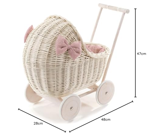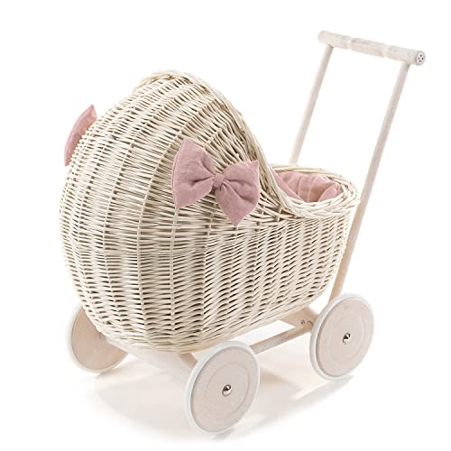e-wicker24 Alles aus Weide DESAYER PUPPENWAGEN AUS WEIDE MIT LEINEN BETTWÄSCHE, Spielzeug AUS WEIDEN IN BEIGE, NATÜRLICHE KINDERSPIELZEUG, EIN Geschenk FUR EIN Kind (rosa)