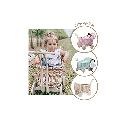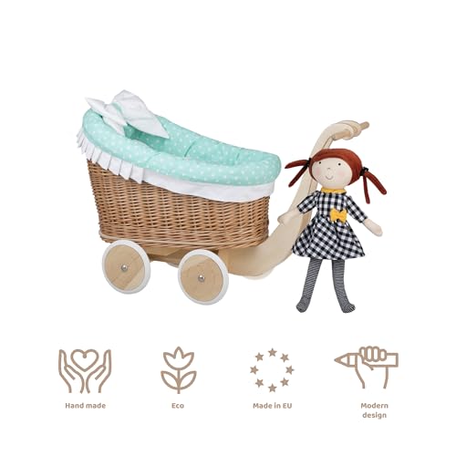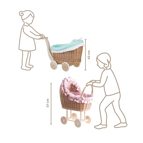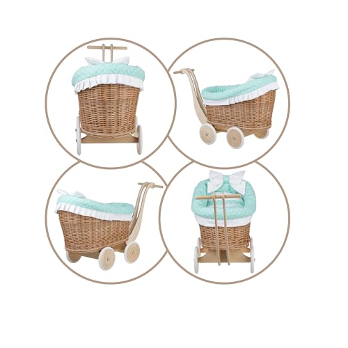 e-wicker24 Alles aus Weide Puppenwagen aus Weide mit Bettwäsche perfekte Geschenkidee Korbpuppenwagen schöner Spielzeug aus Korbgeflecht Korbwagen für Puppen Spielzeug für Mädchen (Schwan, Mint)
