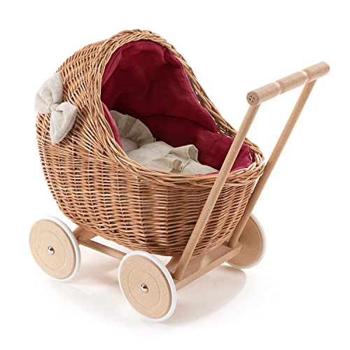 e-wicker24 DESAYER PUPPENWAGEN AUS WEIDE MIT LEINEN BETTWÄSCHE, Spielzeug AUS WEIDEN, NATÜRLICHE KINDERSPIELZEUG (Rot), 48×28 H47
