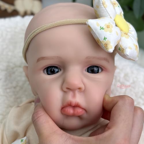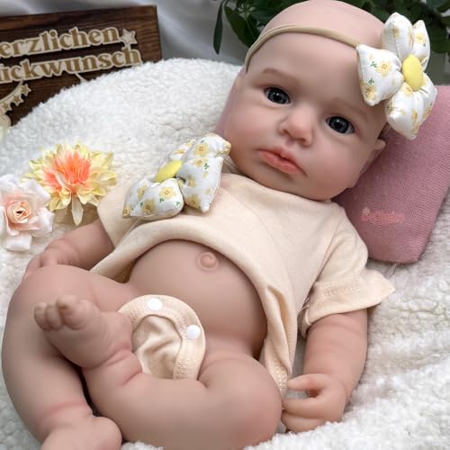 Lebensechtes 45 cm großes Reborn-Baby-Mädchen leer Silikon: Diese realistische Vollsilikon-Babypuppe hat große, ausdrucksstarke Augen, handgepflanzte Wimpern und zarte, handbemalte Haut in rosigen Neugeborenentönen. Hergestellt leer Platinsilikon, ist sie weich, kuschelig und anatomisch fehlerfrei für ein authentisches Erlebnis.