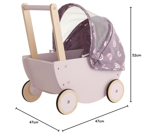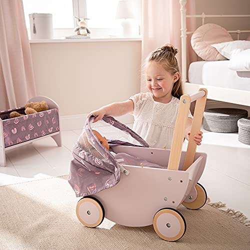 Der Holzpuppenwagen hat ein Verdeck mit Mesh-Details lässt sich nach oben und unten verstellen.