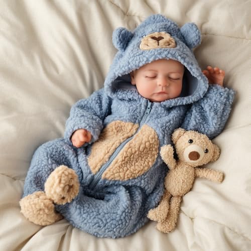 🏆Komplettset für Babys: 1 realistischer Babyjunge, 1 warmer Fleece-Strampler in Bärenform (wie auf dem Abdruck gezeigt), 1 Geburtsarmband, 2 beruhigende Rasseln, 3 Fütterungszubehör; Vom Stillen bis zur Interaktion wird das intensive Elternerlebnis abstandslos wiederhergestellt!