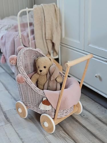 Korb Puppenwagen aus Weide, mit Bettwäsche, Korbpuppenwagen, Hellrosa, rosa, mit Pompoms
