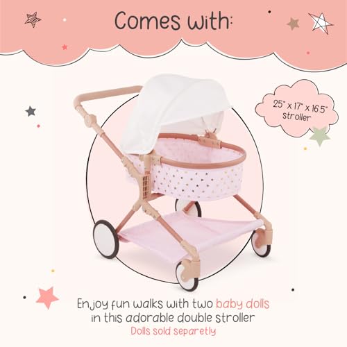 Spazieren gehen: Der LullaBaby Doppel-Kinderwagen hat ein niedliches rosa Design mit goldenen Sternen und ist perfekt geeignet, um Zwillings-Babypuppen überall hin mitzunehmen (Baby Puppen separat erhältlich)