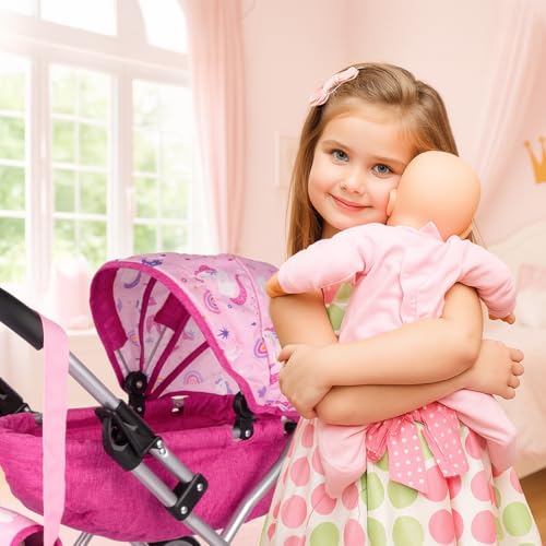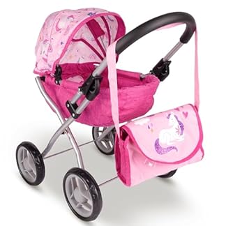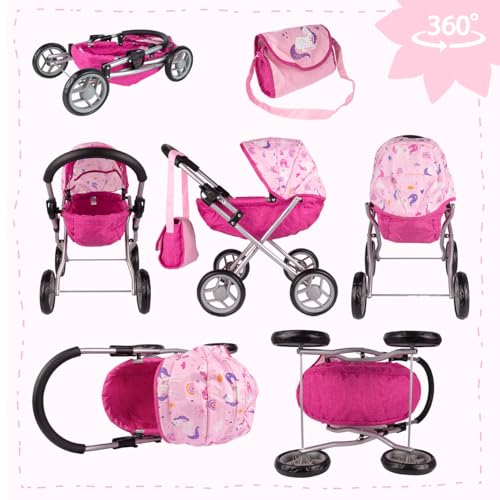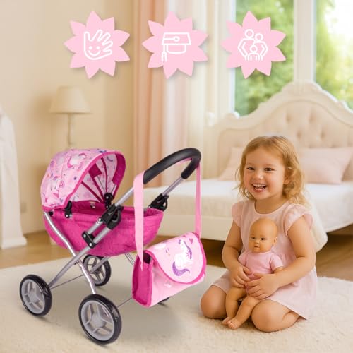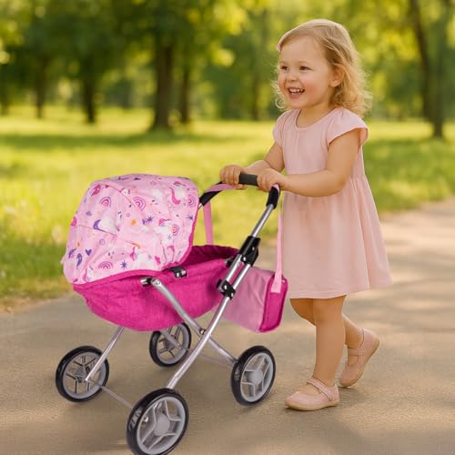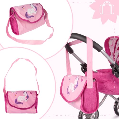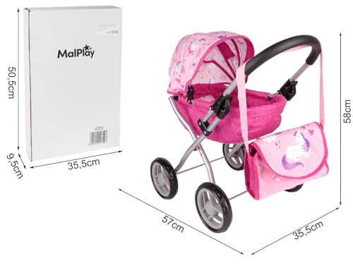 Malplay Puppenwagen mit Tasche verstellbares Verdeck große Räder Rosa Einhorn Motiv ab 3 Jahren Geschenk