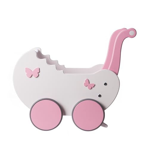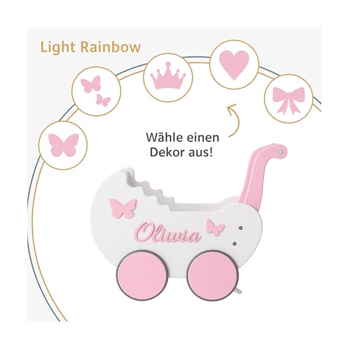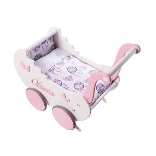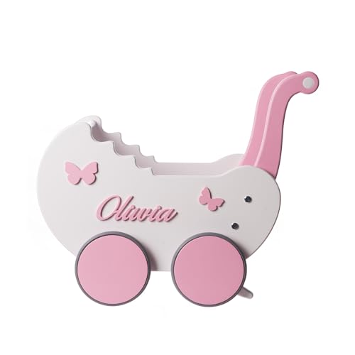 Puppenwagen mit Namen – Holz, ab 1 Jahr – Handgemacht & Sicher – Rosa Weiß – Geschenk für Kleinkinder