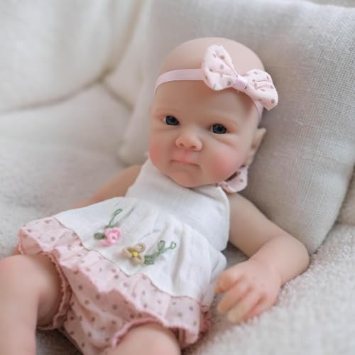 【Mini-Babypuppe】 Diese echte Babypuppe trägt ein weiches Baumwollkleid in Weiß und Blau, ein süßes Schleifen-Haarband auf ihrem Kopf, Sie können sie mit Micro-Babygröße Kleidung verkleiden
