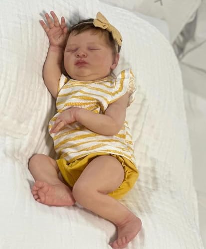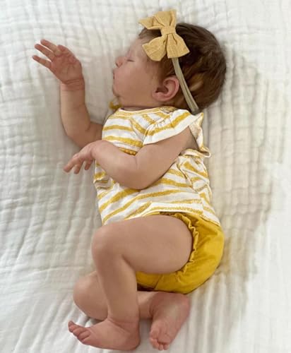 【Lebensechte Babypuppe】 Diese echte Babypuppe trägt ein weiches Baumwollgelb Outfits, ein süßes Schleifen-Haarband auf ihrem Kopf, Sie können sie mit 0-3 Monate echter Babygröße Kleidung und Windeln verkleiden