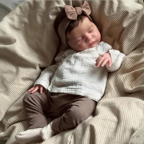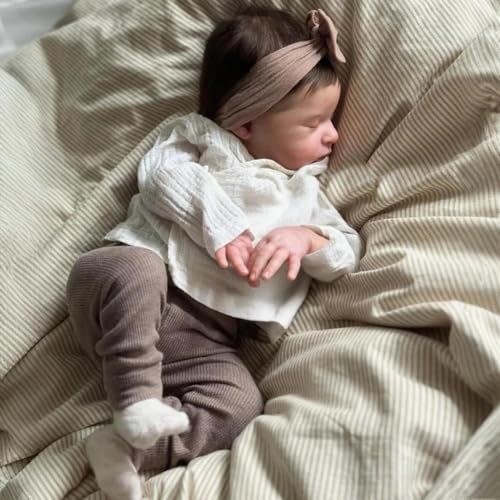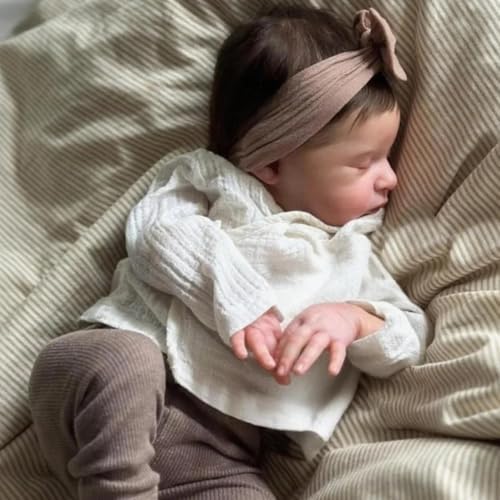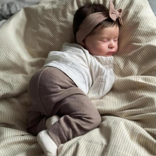 【Lebensechte Babypuppe】 Diese echte Babypuppe trägt ein weiches Baumwolloutfit in Weiß und Braun, ein Schleifenstirnband auf ihrem Kopf, Sie können sie mit 0-3 Monate echter Babygröße Kleidung und Windeln verkleiden