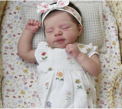 【Lebensechte Babypuppe】 Diese echte Babypuppe trägt ein weiches Baumwoll-weißes Blumenoutfit. Sie können sie mit 0-3 Monate echter Babygröße Kleidung und Windeln verkleiden