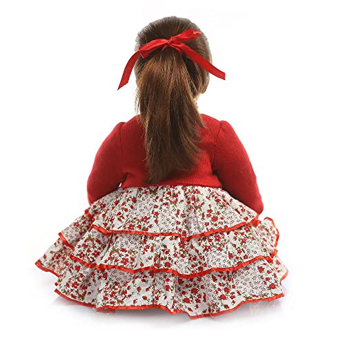 SHHYD 24 Zoll 60cm Reborn Baby Puppe Mädchen Reborn Babypuppen Lange Haare Rotes Kleid Mädchen Lebensecht Weiches Silikon Vinyl Reborn Baby Dolls Handgemacht Spielzeuge
