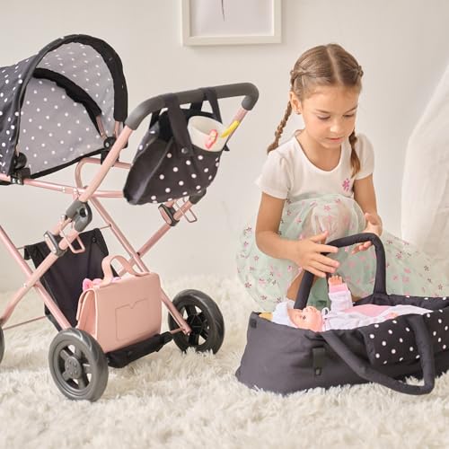 Teamson Kids Puppenwagen 2-in-1 Klassiker in Schwarz mit Zubehör, Puppenbuggy für Kinder Rollenspiele, stabil und wandelbar