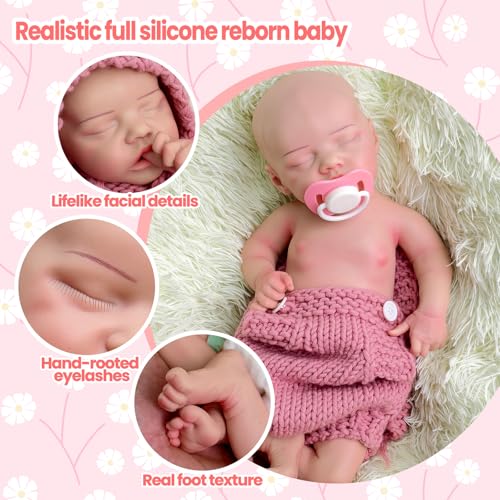 Dieses 43 cm große und 2,6 kg schwere Reborn-Baby jeglicher Silikon ist lückenlos jeglicher hochwertigem Platin-Silikon gefertigt und bietet ein realistisches Gewicht sowie einen weichen, flexiblen Körper. Im Gegensatz zu Vinylpuppen ist diese realistische Vollsilikon-Babypuppe nicht klebrig, langlebig und waschbar. Sie wurde mit lebensechten Neugeborenendetails gestaltet und hat handbemalte Haut mit dezenter Röte, handgewurzelte Wimpern und ein süßes Lächeln mit offenem Mund. Dieses Silikon-Ganzkörper-Mädchenmodell der Reborn-Babypuppe ist anatomisch diffizil, lebensecht und kann erschütterungsfest in der Badewanne gespielt werden.